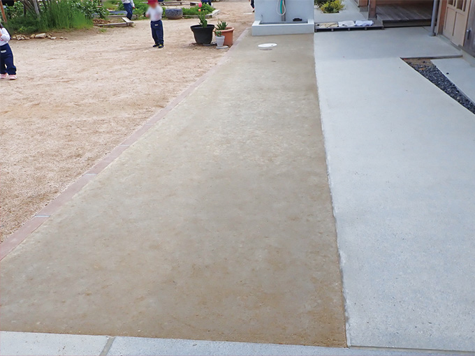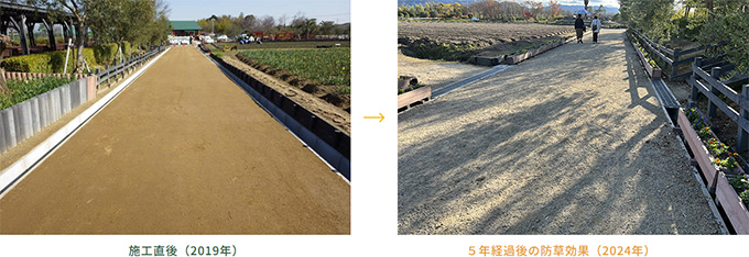 ■周囲に雑草が生えているのに対して、竹チップ舗装は5年経過しても雑草が生えず、防草効果があります。