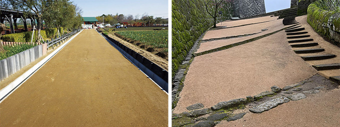 土系の歩行者系舗装は、公園、遊歩道などに欠かせない簡易舗装です。近年の地球温暖化により、舗装の表面温度の低減や、保水性が求められる中、その需要が広がっています。しかしながら、土系の舗装は、アスファルト舗装と比較すると耐久性がなく、舗装表面の劣化や曲げ耐力不足によるひび割れが生じやすいと言われています。