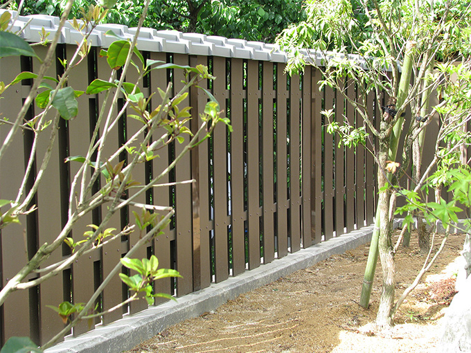 やまと塀は、樹脂製の木調フェンスです。主に目隠しフェンスや境界フェンス、植栽と合わせたデザインフェンスとして使用します。素材は100%リサイクルのポリスチレン樹脂を使用しており、耐水性・耐候性にすぐれています。天然木とちがい色褪せしにくく、ささくれや腐食もありません。豊富なカラーバリエーションがあり、板の隙間や高さを変えることで様々な場面でご利用頂けます。板材を木目シボ加工を施した「+シボ」や、高耐候の「UVタイプ」に変更することもできます。アルミフェンスのように規格が決まっていませんので個々の現場に合わせた自由な設計が可能です。金属フェンスにはない温かみがあるのも特徴です。