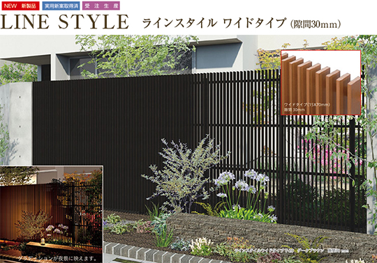 人気の縦格子に奥行の深い小桟タイプが新発売。従来品と比べ、目隠し性能が向上しました。また、ラインスタイル ワイドタイプは、 1つ1つのユニットサイズが小さいため、より施工性が高くなりました。