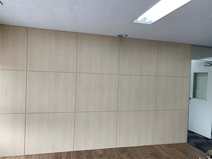 近年、商業施設・オフィスビル等、塩ビ装飾フィルムを工場貼りしたボード工法でのスペックが主流となっていますが、弊社でも、ボード工法用商材「WALLISE board-K」を製造・販売しております。