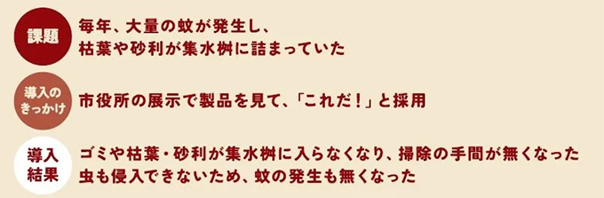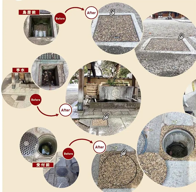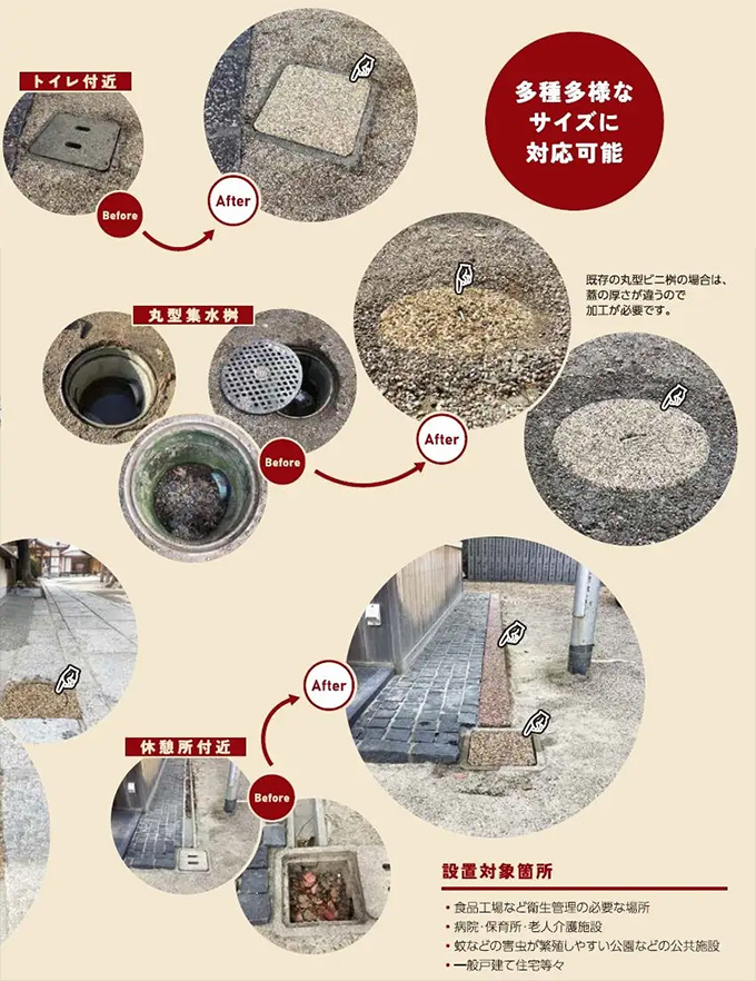 大阪府高槻市の野見神社に全面的に導入したところ「景観を損ねない蓋」「蚊の発生が激減した」として高く評価され、飛散する砂利や落ち葉の流入も防ぎ、景観美と衛生管理の両立が可能になっています。