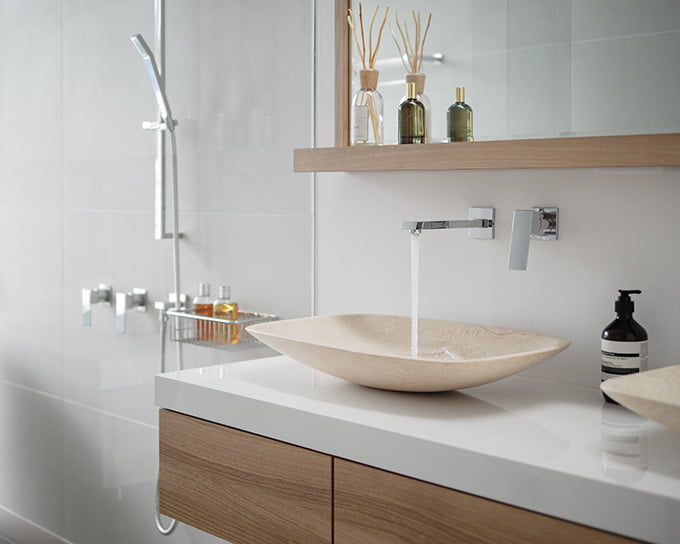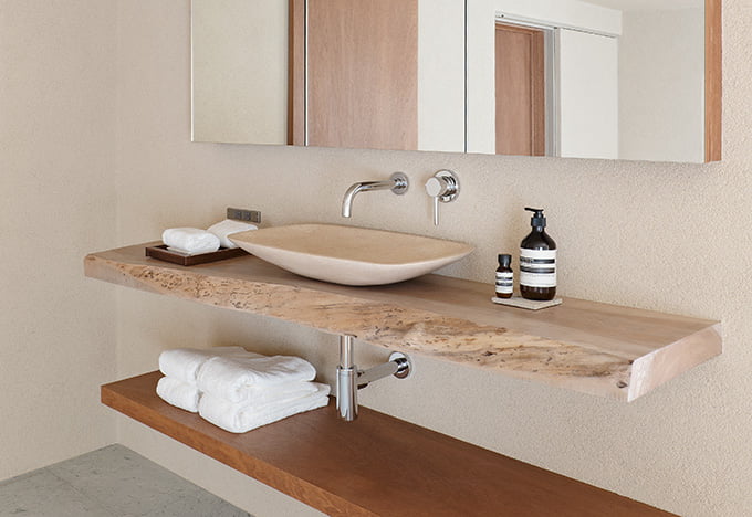 【施工事例紹介】ライムストーンの洗面ボウルが生む、ミニマルな洗面空間