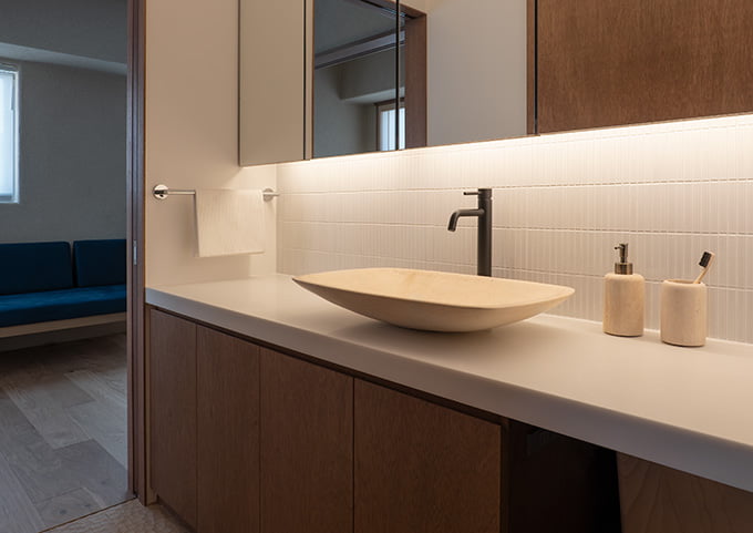 温かみのある木製天板とも共鳴し、パウダールームを質の高い設えへと昇華させます。