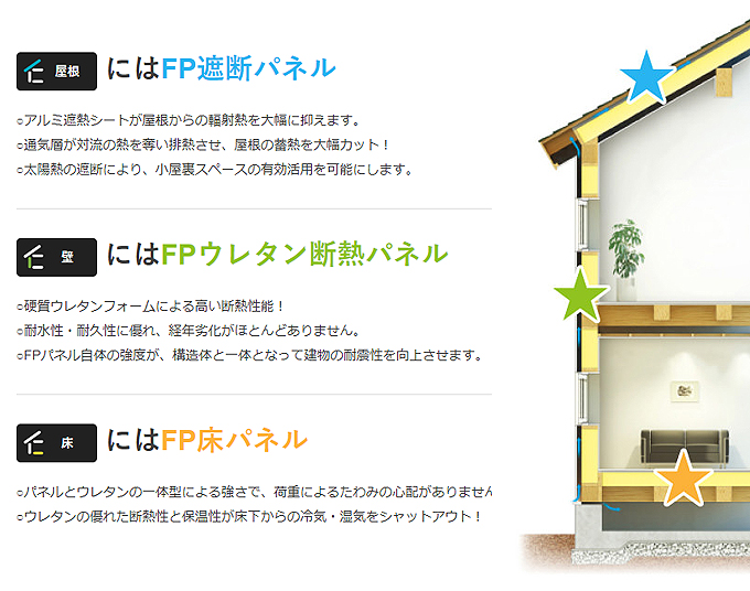 人が健康で快適に暮らせる環境は、夏で26~29℃、冬で19~22℃、湿度は40~60%くらいといわれています。私たちの住む日本はどの地域でも自然のままの快適な温度で過ごせるのは1年のうち数ヶ月しかありません。 そこで、1年を通じて快適な環境を保てる住まいをめざし、「FPパネル」は生まれました。屋根・壁・床3つのFPパネルで優れた断熱性、気密性、高い遮熱性を実現、「FPの家」加盟工務店を通じ、全国のみなさまに快適な暮らしをお届けしています。
