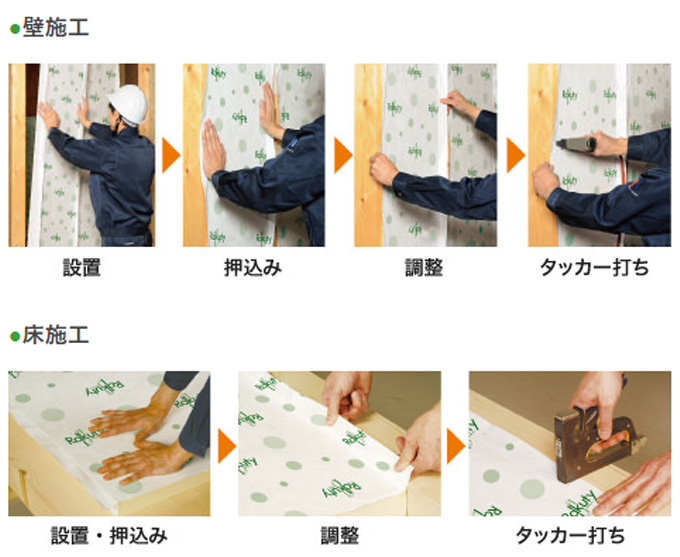 側面の突起をつぶしながら押込み、設置します。押込みすぎた時にも二重フィンを持ち、簡単に引っ張り調整が可能です。タッカー打ちにより、長期的に断熱材がずれる心配もありません。