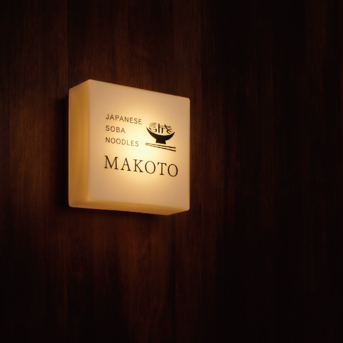 あたたかなイメージを印象付ける照明のようなガラスサイン。