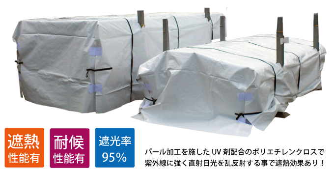 パール加工を施したUV 剤配合のポリエチレンクロスで紫外線に強く直射日光を乱反射する事で遮熱効果あり!