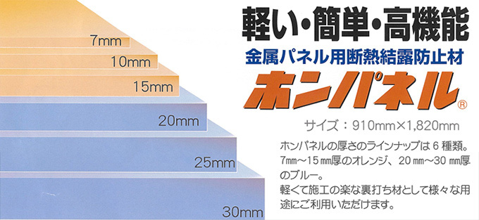 金属パネル用断熱・結露防止材「ホンパネル」は軽い、簡単…だけでなく耐水性、防振性、複合性、加工性等々、実に機能性に富んだ材料です。7mm~15mm厚のオレンジ、20mm~30mm厚のブルーのカラーでパネルの厚さは6種類ご用意しています。軽くて施工の楽な裏打ち材として様々な用途にご利用いただけます。断熱材・結露防止材をお探しの方は、是非一度チェックしてみてください。