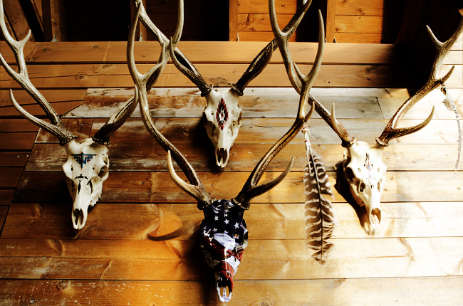 野生のエゾ鹿の角付頭蓋をキャンバスに見立て