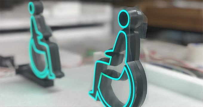 材料に植物由来のPLA樹脂を採用。廃棄後、最終的に二酸化炭素や水に分解する屋内用サインです。