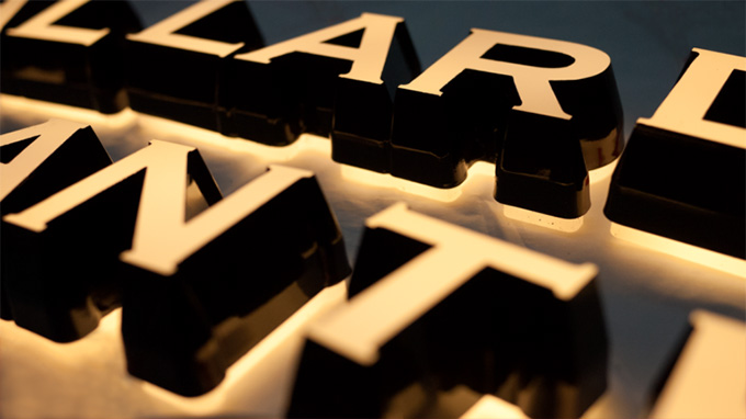 チャンネル文字ではどうしても表現しきれない小さいサイズや線幅の細いロゴを緻密なルーターカットにより削り出し、指定された発光面を均一に発光させることを実現。