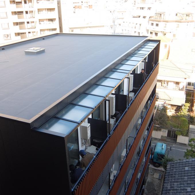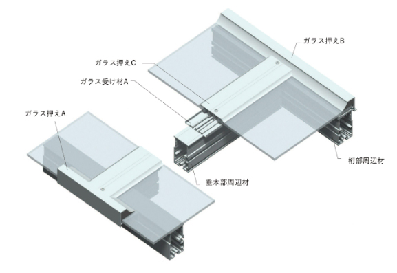 四方の枠材・垂木材の工夫により抜群の耐風性能を誇ります。高層ビルまで対応可能。耐風圧性能は強度計算に基づく設計にて対応しています。