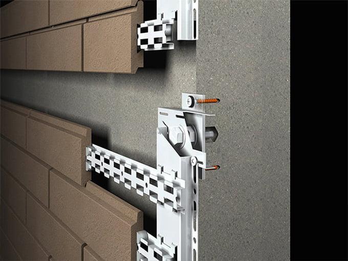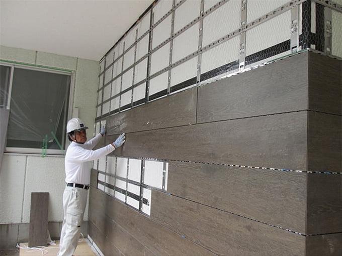 本発明により、タイル及び石材を壁面のどの位置からでも連続的かつ容易に施工できるため、現場作業効率の向上が見込まれる。加えて上記スライド式金物により長期に亘りタイル及び石材の剥落を防止することができるため、施工時の安全性を大きく向上させることにも貢献している。