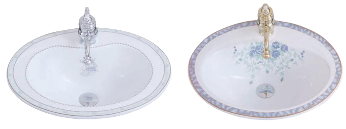 楕円形、丸形、スクエア(四角)系のラインナップがあり、 通常のホワイトの他に色柄系も揃えてあります。カラン穴は1穴、3穴(4インチ)、3穴(8インチ)タイプがあ り、水栓をカウンターに取付けるタイプもあります。