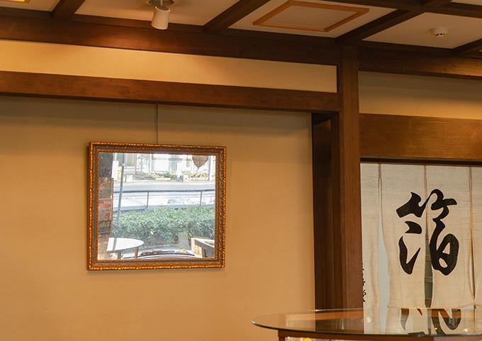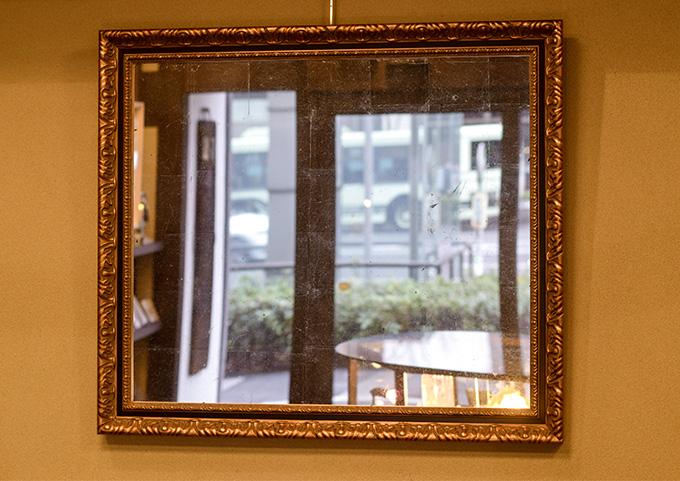 西洋ではメジャーな箔押し技法、ウォータギルディングという技法で、ガラスに箔押しをしています。日本古来の箔押し技法とは違い、鏡面のように仕上がることが特徴です。