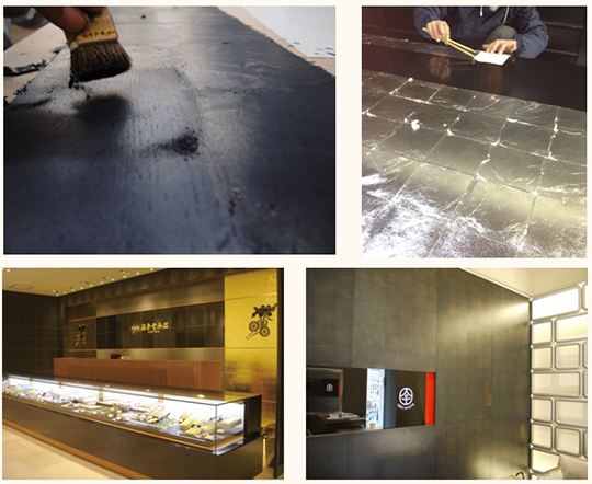 ■ホテル、ジュエリーショップ、店舗、住宅、その他現代建築の内・外装、家具等による実績がございます。樹脂、木材、紙、ガラス、など箔装飾は対象を選びませんし、基材により仕上がりが異なる場合がございます。デザインに合わせ事前に綿密にヒアリング・お打合せを行ったあと、箔押し基材支給や現場施工など、状況に合わせた方法でイメージを実現します。