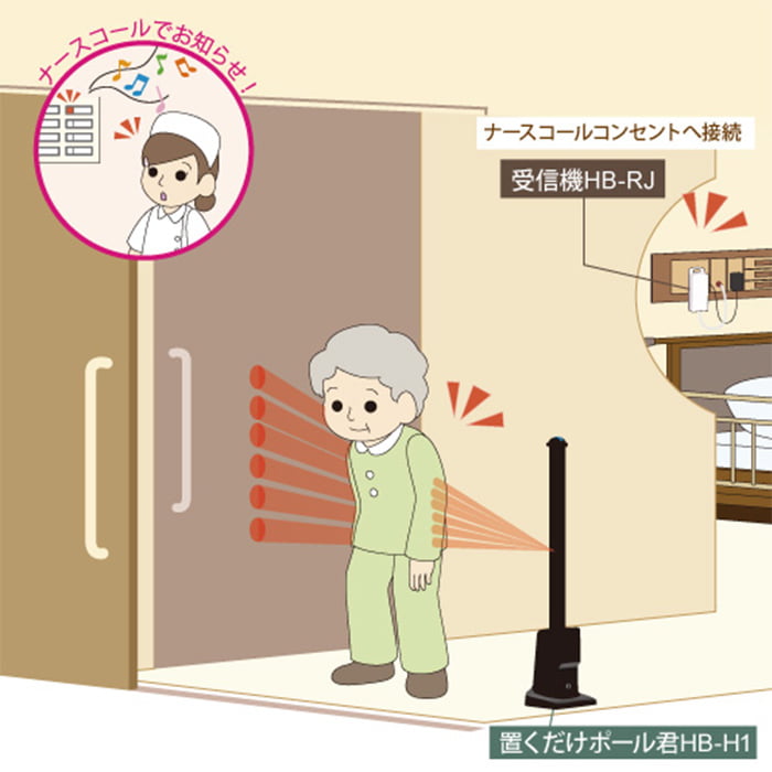 対象者様の転倒リスクが高い時間(夜間・早朝)は、スタッフの人数が少ないので、ポール君があると安心して対象者様の見守りが出来た。また部屋の出入り口に置くことで、対象者様は居室内で自由に過ごしてもらい、部屋を勝手に出て行ってしまった時は、ポール君が検出してナースコールで知らせてくれるので役にたった。