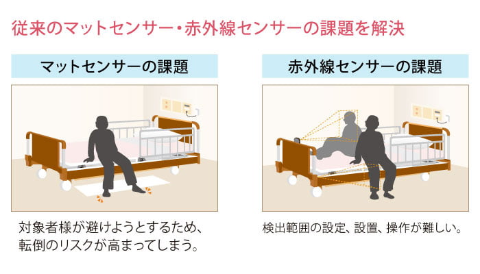 Q. マットセンサーだと対象者様がよけて離床してまうことがありますが、転んで怪我をされてしまう心配があります。対象者様に気づかれにくい離床センサーはありますか?
