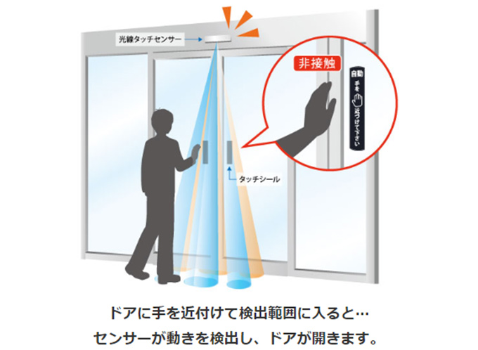 光線タッチセンサーなら手を近付けるだけで自動ドアを開閉できるので、触れずに衛生的で安心です。