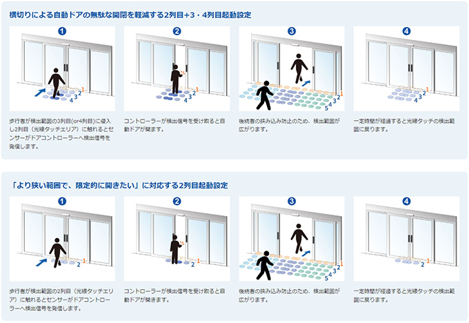 通行者を検出して開く条件を2つのパターンから選んで自動ドアの開閉が行えます。