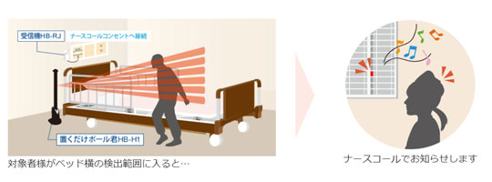 ■「置くだけポール君」は、ベッドの横に置く赤外反射方式の離床センサーです。
