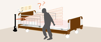 自動ドアセンサーで培った技術を活かした赤外反射方式の離床センサーです。検出範囲が見えないので対象者様に気づかれにくく、センサーを外そうとしたり飛び越えようとする危険を減らします。