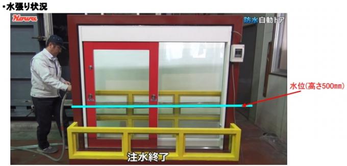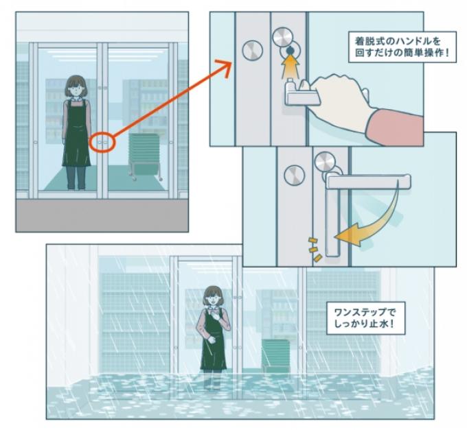 簡単に素早く浸水をシャットアウト!ハンドルひとつで自動ドアが防水ドアに!