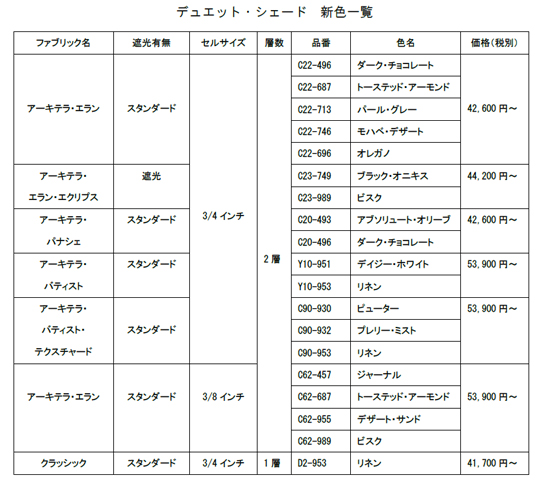 デュエット・シェードの従来の三層、一層のシリーズに、全19の新色を追加します。需要の高い、茶、グレー、グリーン系を充実させ、コーディネートのしやすい淡い色に加えて、ビビッドな色も加わります。