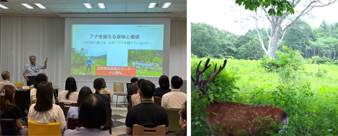 写真右:二ホンジカも遊びに来るようになりました。落葉広葉樹のブナは、300年以上生きると言われています。次世代につながる取組みになれば、と考えています。