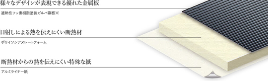 遮熱効果のある塗装をした金属板と断熱材を一体化した外壁材なので、夏は外の暑さが室内に伝わるのを防ぎ、冬は暖気を外へ逃さず、1年を通して快適にお過ごしいただけます。