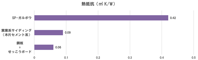 熱抵抗値で比較すると、鋼板とせっこうボードを使用した場合0.06㎡K/Wとほぼ断熱性はありません。窯業系サイディングでは0.09㎡K/W、断熱材が含まれたSP-ガルボウでは0.42㎡K/Wです。(熱抵抗は数値が大きいほうが断熱性に優れています)