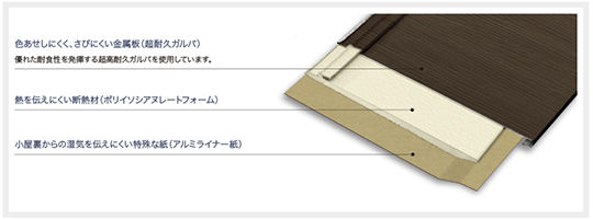 表面材には「超高耐久ガルバ」の採用により、穴あき25年保証と沿岸地域への保証範囲の拡大を実現。従来の遮熱性・断熱性を受け継いだ、さらに沿岸地域で安心してお使いいただける耐久性にも優れた屋根材です。