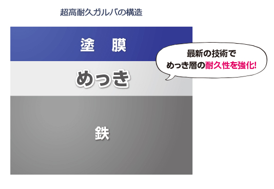 めっき層は鉄板をさびから守ります。超高耐久ガルバはそのめっき層をさらに強化したもので、従来のガルバ鋼板と比べて3倍超の寿命が期待できます。