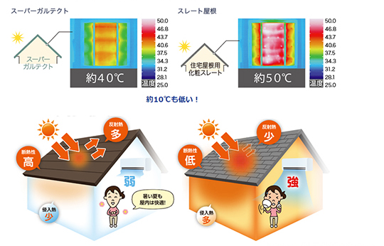 表面の塗装に遮熱効果があるので、屋根が高温になるのをおさえて、室内への熱の侵入を防ぎます。