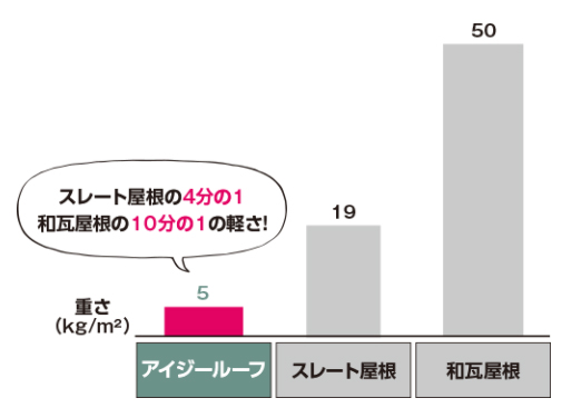 「アイジールーフ」は金属板と断熱材でできており、他の材料と比べて軽く、建物への負担が小さくなります。
