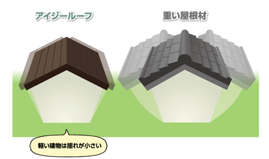 「アイジールーフ」を使用した場合、建物の重量も軽くなり重心も低くなるのため地震時の揺れ幅が小さくなります。