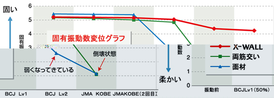 想定外の地震を考えた場合、「固さ」だけでは受ける衝撃が大きくなり、壊れる可能性が高くなります。 X-WALLなら、固さはもちろん、振動と揺れを効果的に吸収し、復元力間柱がしなりによる「粘り強さ」を 発揮。衝撃をしなやかに受け止めます。