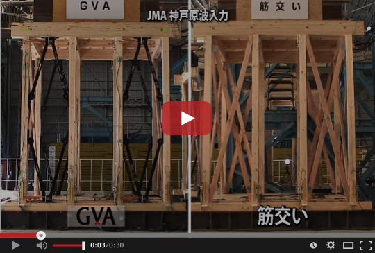 阪神・淡路大震災の地震波で比較振動実験「GVA設置」「未設置」の試験体を比較し、GVAのエネルギー吸収力で揺れを抑えられることを実証。
