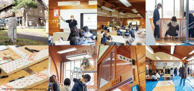 改修作業の前には、最終仕上げを担当する職人さんから児童たちへ「断熱材によって得られる断熱効果」の説明と裁断と設置に関するワークショップを実施。また、改修作業は児童だけでなく、職人さんと保護者の皆さまも協力して担当。今回の「断熱改修プロジェクト」は無事に終了しました。