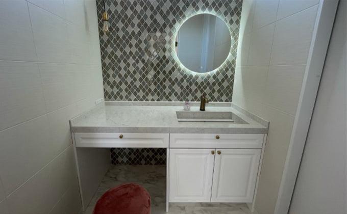 洗面ルームやバスルームの雰囲気づくりは、壁面やミラーの印象に合ったカウンター選びも大事です。スタイリッシュで落ち着きのあるクオーツストーンは、高級感を醸し出しながらも傷に強く、染み込まない素材で衛生的。