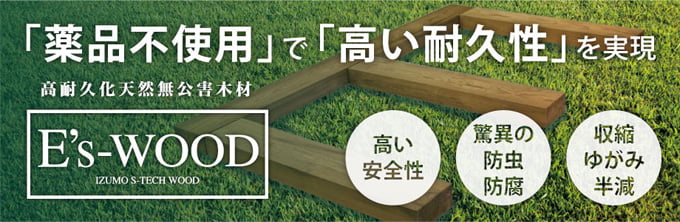 高耐久化天然無公害木材「E’s-WOOD」(別称:エステックウッド)は、薬品を一切使用せず、200度以上の窯素加熱で木の腐りやすい成分を分解。遊歩道で20年を超える実績をもつなど、耐久性が飛躍的に向上。軽量かつ高い寸法安定性で施工しやすいのも魅力です。