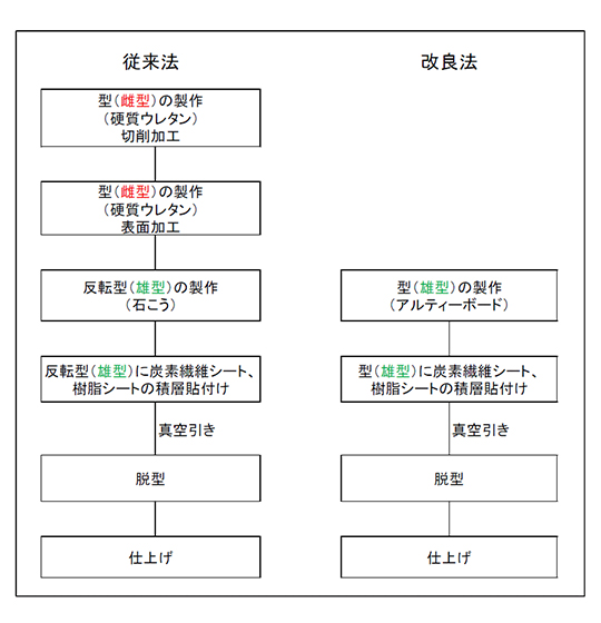 従来の硬質ウレタン等の有機系型材と比べると、下図のようにメス型の製作工程を省略するために、全体の工期を短縮することができます。