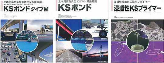 本工法で使用する材料には、「浸透性KSプライマー」、「KSボンド」、「KSボンドタイプM(機械塗布用)」があります。