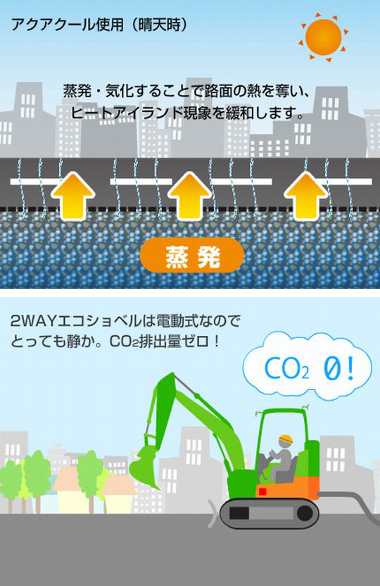 他にも、雨天時に雨水を吸収、晴天時にこれを蒸発させることで路面温度の上昇を防ぎヒートアイランド現象を緩和する「アクアクール」や、CO2・排気ガス有毒物質を全く排出せず騒音・振動が少ない「2WAYエコショベル」の開発も行っております。