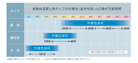 幅広い温度範囲(5~60℃)での施工に対応するため、粘度調整した、夏用、冬用、春秋用の3タイプを用意しています。