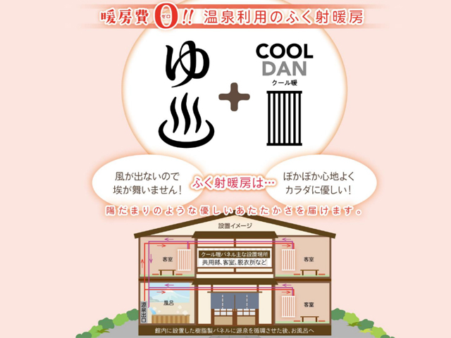 暖房費ゼロ!温泉利用のふく射暖房 ふく射暖房は、風が出ないので埃が舞いません! ぽかぽか心...