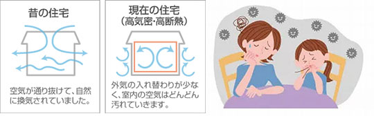 しかし、屋外の気温や湿度の影響を緩和できるようになった近年の住宅は、その一方で自然な換気ができにくいという問題点が出てきてしまいました・・・