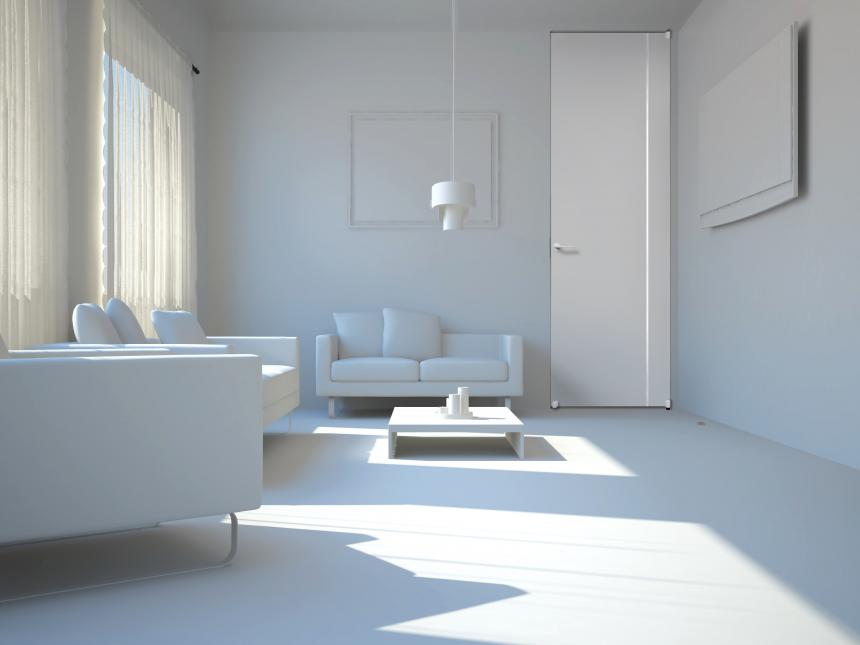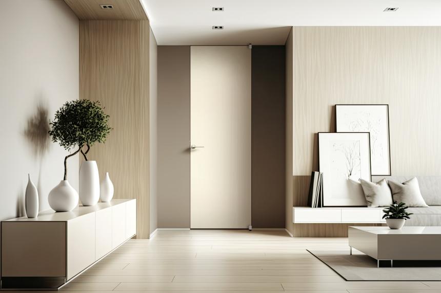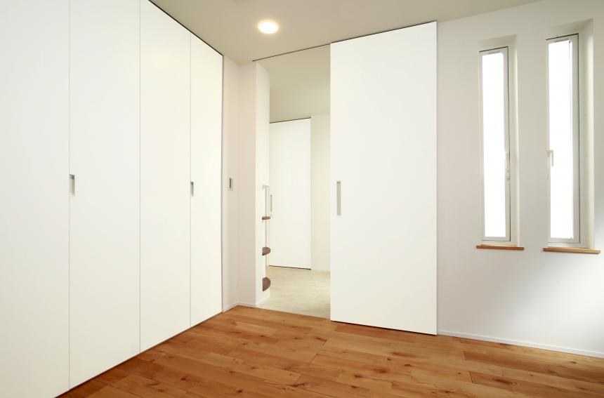 ウレタン塗りつぶしでマットに仕上げた白い扉は、 珪藻土を使った塗り壁によく合います。