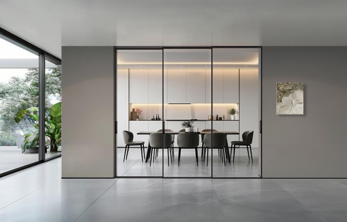 この商品の他社との最大の違いは、フレームの細さです。一般的なアルミフレームは、金物の機構上3~4cmの幅が必要ですが、ミニマルなデザインを好む建築家や建主からのニーズに応えられていませんでした。そこで当社は金物の納まりを工夫して試作を重ね、四周全てのフレームを業界最細の1cmまで細くしました。フレームをスリムにすることで意匠性を高めた本製品は、収納戸としてはもちろん、空間を間仕切るハイセンスなガラスパーティションとして、高級住宅やハイクラスマンションでのニーズに応えるインテリアドアです。
